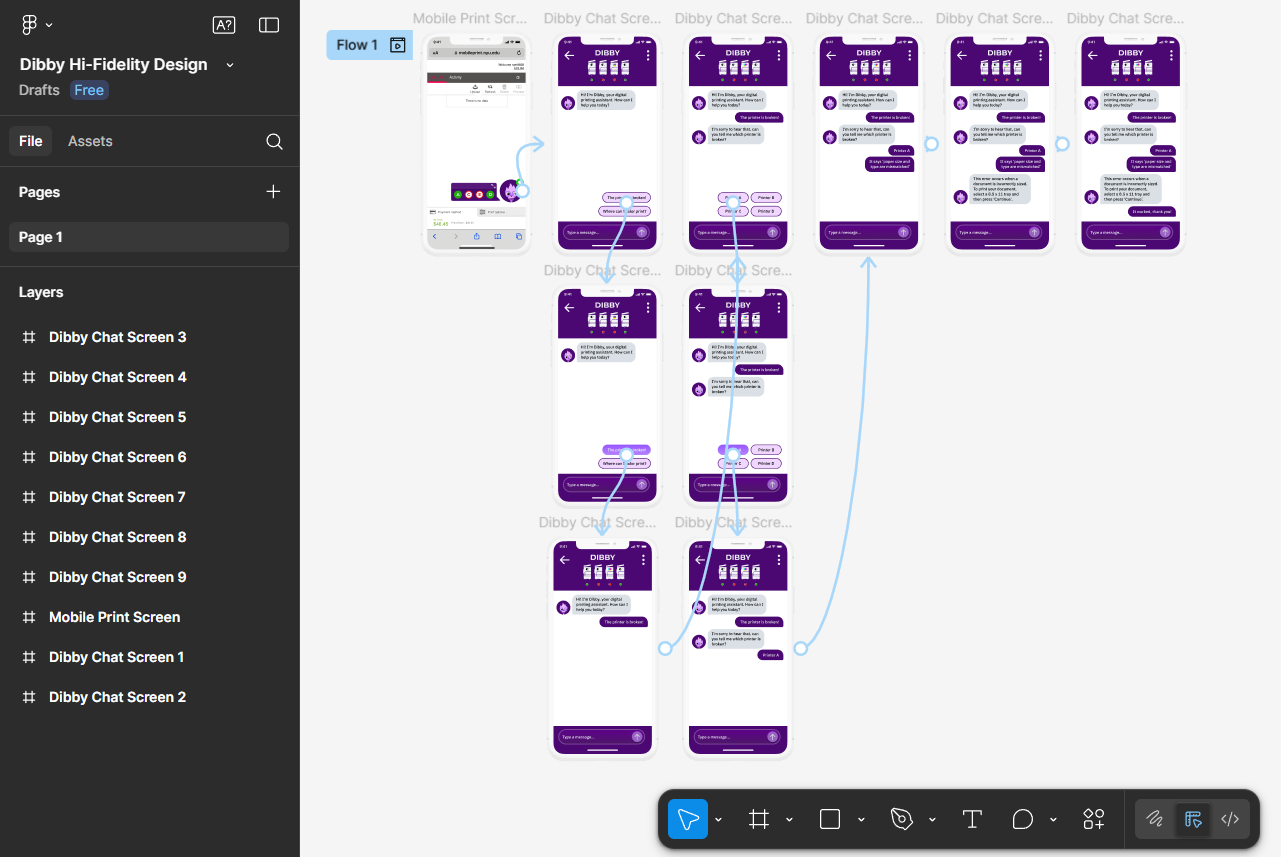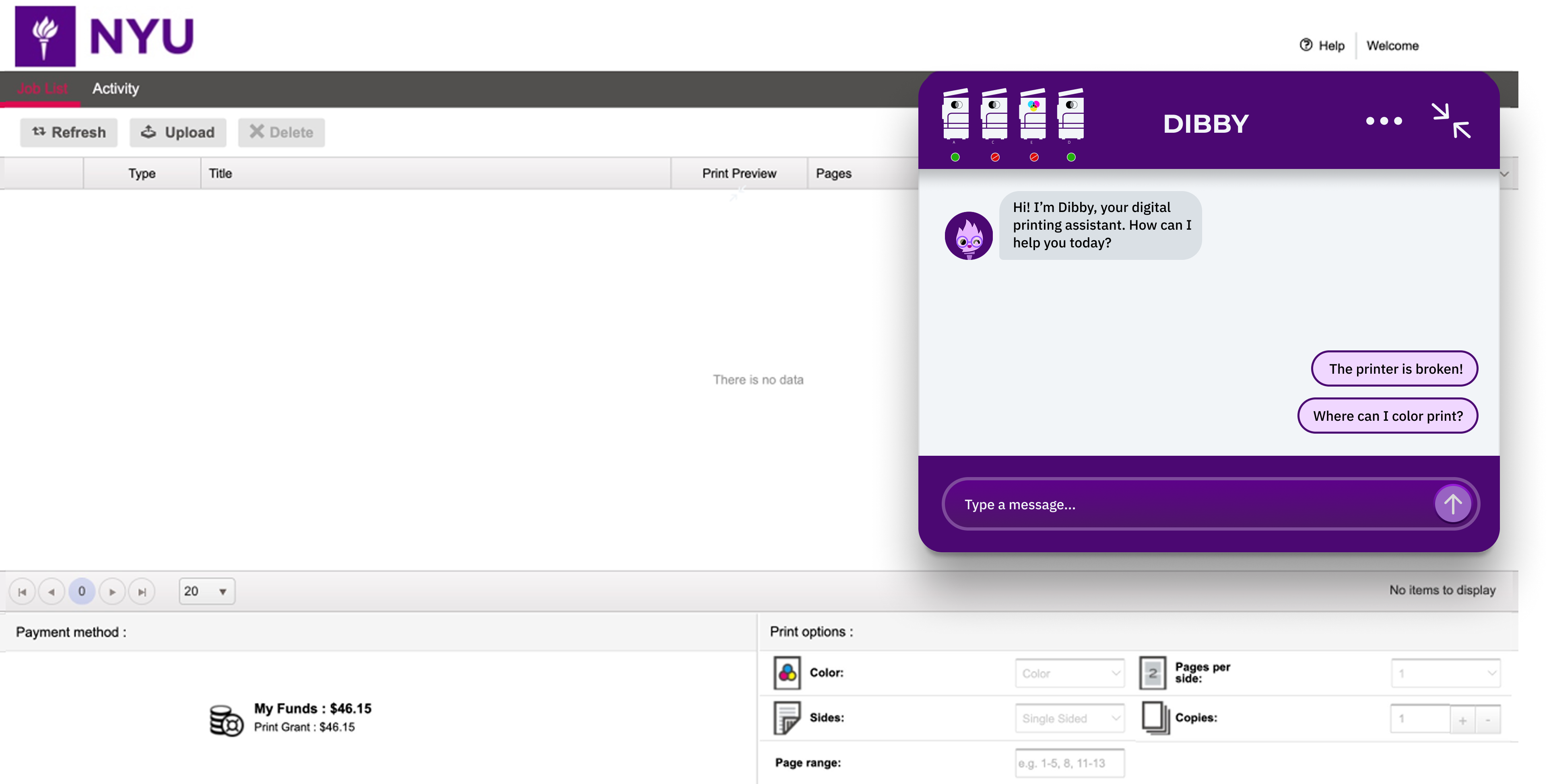 Dibby is a chatbot assistant that leverages AI to help users troubleshoot printer errors, streamline the print refund process, and generate automated logs for the IT staff.